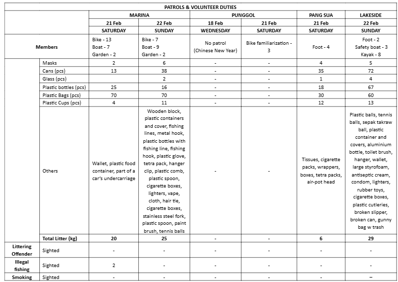 As it is the week of Chinese New Year, there were no CSR or VIA programmes. Our staff and members used the holidays to rest and spend time with their loved ones. Patrols went on as per usual during the weekend and a shocking amount of litter was collected in just two days. While a part of the amount could be attributed to the rainy days that Singapore has been experiencing, which caused litter to get carried from inland to our waters, a part of it was evidently littering caused by irresponsible park users who did not bother to throw their trash properly. Really, more needs to be done to educate the country on proper waste disposal and the impact of littering.