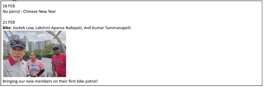 - 3 Bike patrol – 2 Marina, 1 Punggol